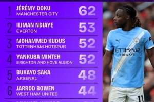 埃弗顿的恩迪亚耶以53次排在第二位,热刺的库杜斯和布莱顿的明特以52次过人分列三四位。