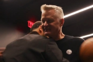 赛后勇士全队在更衣室祝贺科尔,库里为科尔击地“助攻”送上比赛用球,并祝贺道:“在我们结束之前(要先祝贺你),12个赛季为这支一支难以置信的球队做所的事(600胜)。”