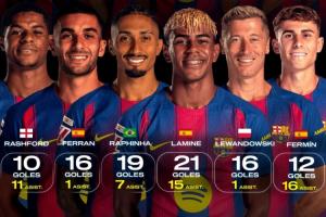 世体统计巴萨球员传射数据:亚马尔21球15助居首,费尔明第二