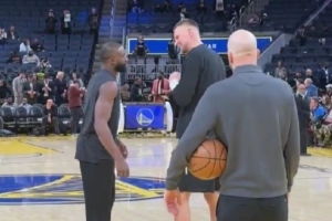 赛前热身环节,勇士新援波尔津吉斯来到场地中央,和前队友杰伦·布朗寒暄几句。