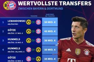 体育资讯02月28日讯 今晚,拜仁与多特将迎来德国国家德比。德转统计了拜仁和多特两队之间的转会,列出了转会时球员身价榜。其中,莱万从多特免签加盟拜仁时身价5000万欧居榜首,格策和胡梅尔斯分列二三。