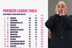 上赛季以来英超积分排名:阿森纳141分居首,热刺67分倒数第二